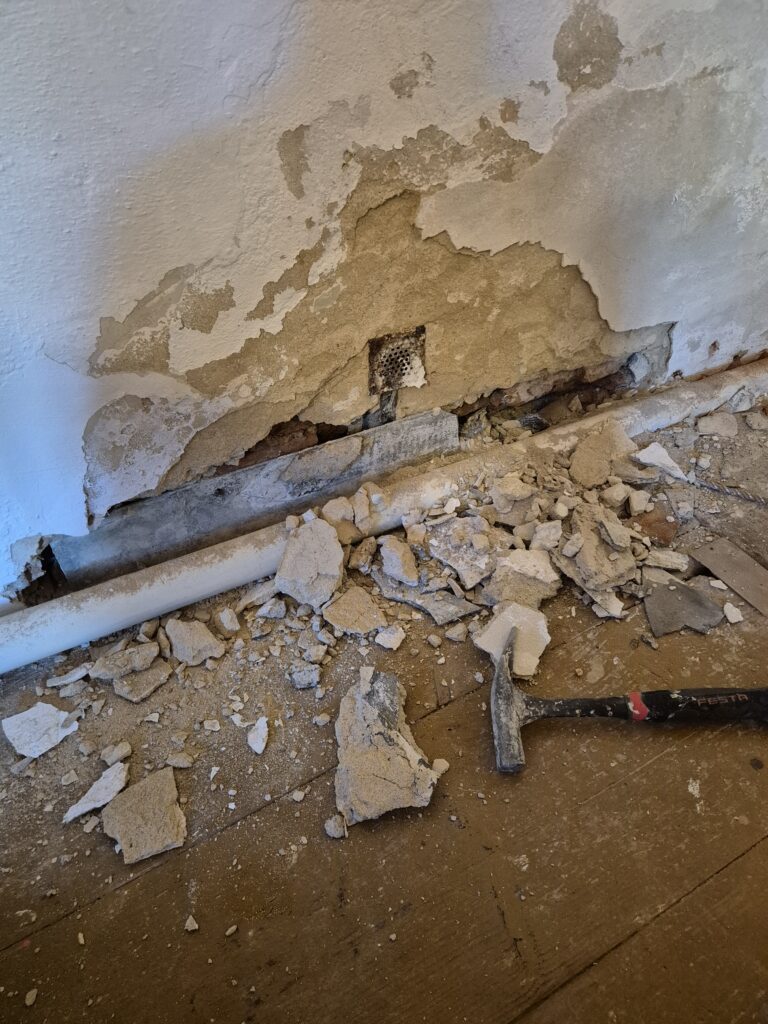 V některých místech předchozí majitelé vybourali části cihel, umístili před stěnu eternit, instalovali větrací otvory a zaomítali. Bohužel tento způsob nebyl dostatečný a celou situaci zkomplikoval. Ale my si poradili!!! Eternit jsme vybourali, stěnu dozdili a přeomítali a poté bylo možné pokračovat v naší práci. 💪💪👍👍